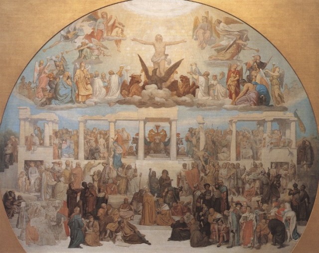 « Il faut que la peinture serve. La justice, l’histoire, la religion, voila des sujets, voila les éléments de l’art, comme on doit l’entendre ». Le propos au militantisme appuyé de Chenavard, qui semble d’ailleurs préfigurer (à l’exception du religieux !) les théories soviétiques, s’oppose bien sur radicalement aux conceptions esthétiques de Baudelaire pour qui la notion d’artiste engagé est une contradiction viscérale, l’artiste n’engageant que lui-même, ce qui est déjà beaucoup lorsqu’il s’agit de Delacroix ou Félicien Rops…