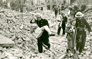 Mais que lisait donc ce père attendri, avant les ultimes vérifications du soir? « Bombings kill (…) horror hits »…peut-on apercevoir sur la une du quotidien. Depuis septembre 1940, Londres et les grandes villes du Royaume-Uni sont en effet soumises au Blitz meurtrier de la Luftwaffe(fig.5 et 6). Années d’apocalypse pour tout un peuple de citadins, galvanisé par l’inoubliable « we shall never surrender » de Churchill.