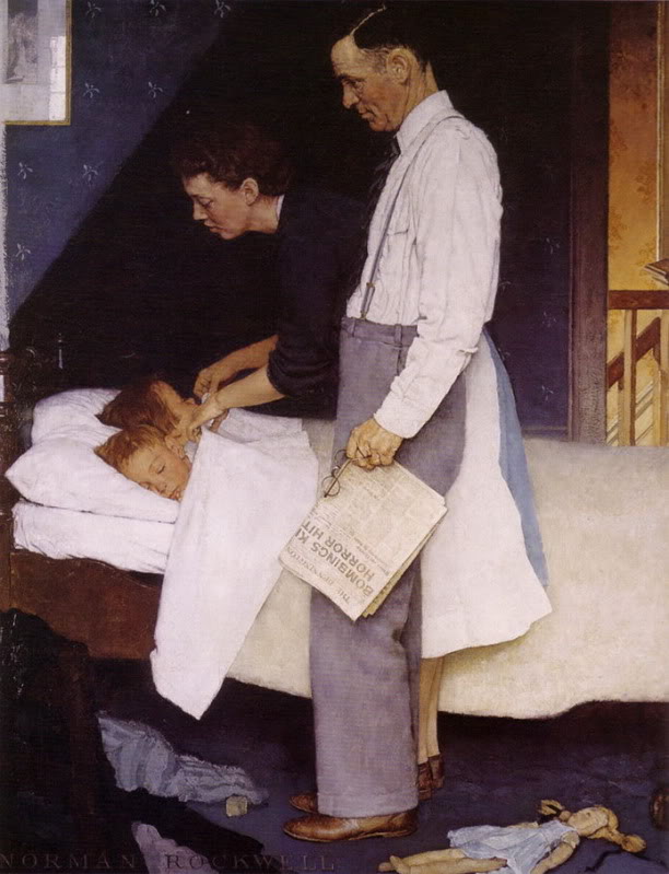 Si l’on voulait abuser un observateur ignorant tout du domaine de la peinture, et c’est finalement la catégorie la plus répandue,  il ne serait pas trop difficile de faire passer la composition de Norman Rockwell pour un tableau de propagande nazie sur le mode de l’ellipse, avec ces parents (dont la rudesse du physique peut tout aussi bien évoquer la Souabe ou la Thuringe) qui veillent sur leurs deux enfants blonds endormis…
