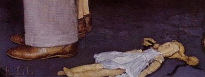 Dans le tableau de Rockwell, la seule allusion visuelle aux dramatiques événements du journal, se réduit à la poupée, qui gît, inerte sur le tapis, presque foulée du pied, comme une victime innocente de l’East End londonien(fig.7). Sinon, le clair de lune qui se reflète sur le verre du cadre, situé dans la partie supérieure gauche du tableau, traduit la profonde quiétude de cette nuit claire: aucun bombardier, bien sur, mais aussi, aucun nuage au dessus de  la maisonnée du Vermont.