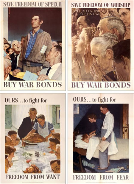 Le 6 janvier 1941, dans le fameux discours qu’il adresse au Congrès et dont il reprend, le 14 août, les grandes lignes pour la Charte de l’Atlantique avec Churchill, Roosevelt énonce les quatre libertés essentielles de la démocratie : outre les libertés d’expression et de culte, il s’agit de protéger chacun du besoin et de garantir sa sécurité.