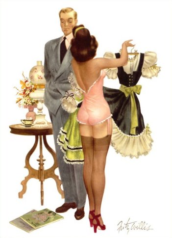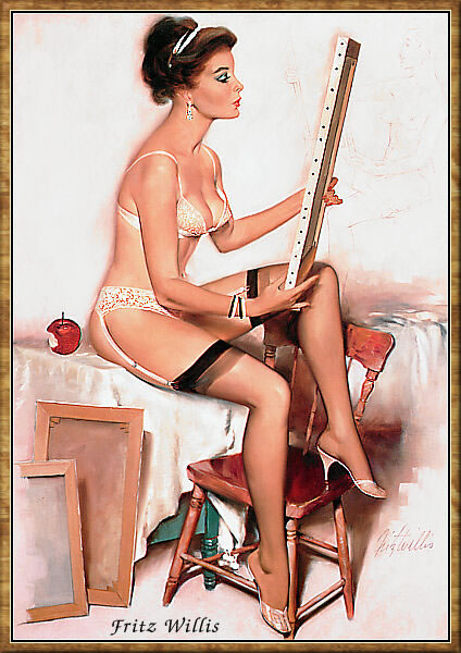 Avec Fritz Willis, ne cherchez pas ces mises en situations si fréquentes à l’âge d’or de la pin up, et pour le moins misogyne, où l’on se moque affectueusement de la « ravissante idiote ». Sa robe ne risque plus d’être tachée par du ketchup, soulevée par un coup de vent, coincée dans un tiroir, tirée par un chat ou un chien, etc… ces artifices les plus inventifs, n’ayant naturellement d’autre but que de nous dévoiler la fameuse ligne du bas, pincée par la jarretelle à son extrémité, standard incontournable de la peinture de charme.